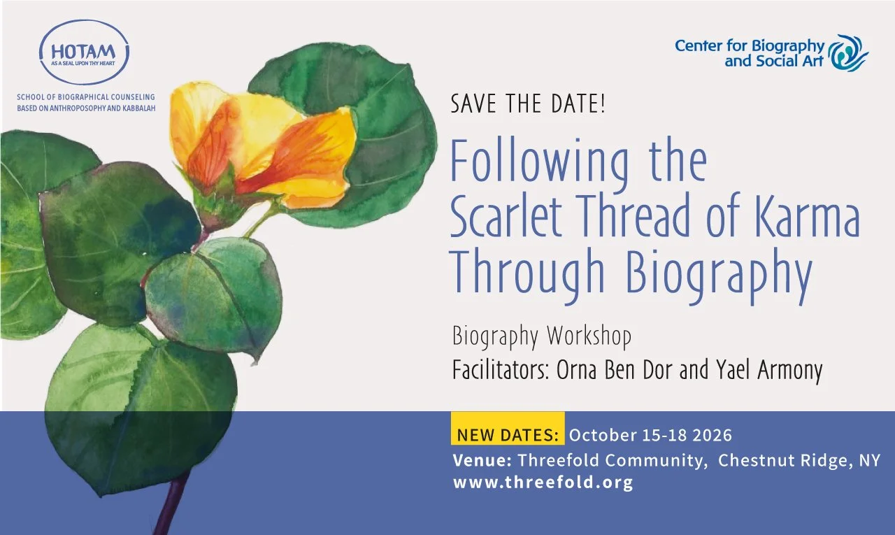 Threefold Community, Chestnut Ridge, NYHotam School and the Center for Biography and Social Art (CBSA) invite you to a unique, immersive workshop exploring the laws of karma as brought to the modern world by Rudolf Steiner. Rooted in years of research and practice at the Hotam School for Biographical Counselling in Israel, this approach weaves together biographical work with insights from Kabbalah to offer a rich and practical path of self-inquiry.